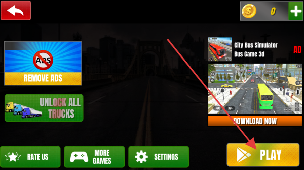 1、点击【PLAY】,进入游戏主界面,可选择移除广告、解锁卡车等,开启模拟驾驶挑战,体验不同卡车任务。