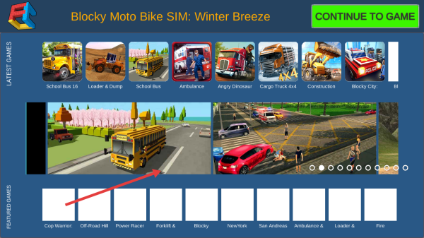 2、选摩托车玩法(或浏览其他游戏如School Bus16),点【CONTINUE TO GAME】确认。