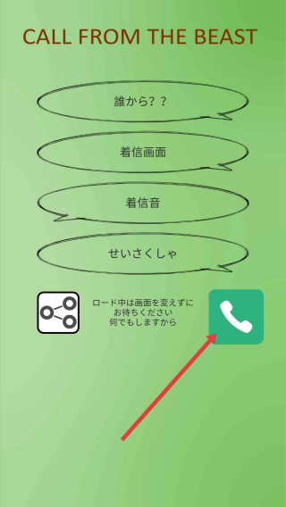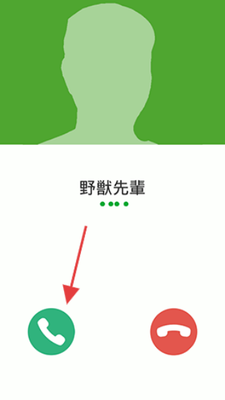 3、操作:绿色接听键、分享按钮,及日语对话气泡(“誰から??”谁打来的?、“着信画面”来电画面等),模拟接听“野兽前辈”来电的趣味场景。