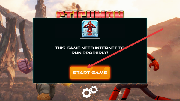 1、游戏启动页,点击【START-GAME】,确认需联网运行,进入【Stickman】的火柴人战斗冒险。