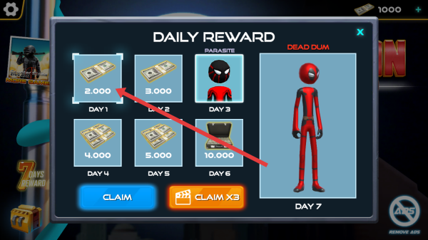 2、在“DAILY-REWARD”界面,按箭头领取“DAY-1”奖励(2000货币),积累资源,用于解锁内容。