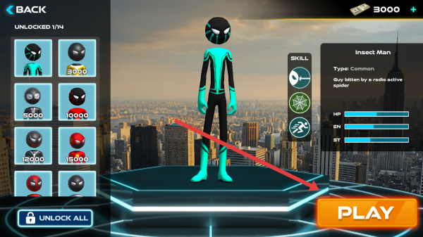 3、角色选择页,选定“Insect-Man”等角色,点击【PLAY】,进入城市场景,开始火柴人战斗关卡。