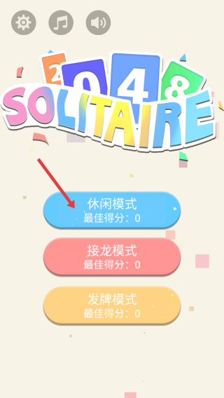 1、模式选择:启动界面选“休闲模式”,另有接龙、发牌模式,记录最佳得分。