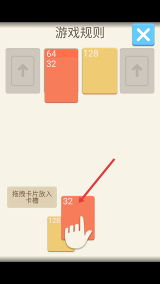 2、规则演示:拖拽数字卡片(如32)入卡槽,同数值合并升级(遵循2048合成逻辑)。