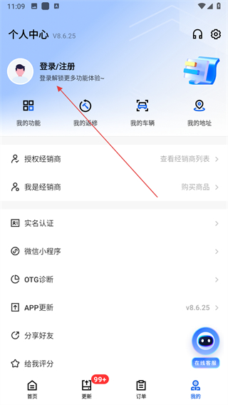 2、在个人中心界面点击登录/注册区域,进入登录方式选择的操作页面。