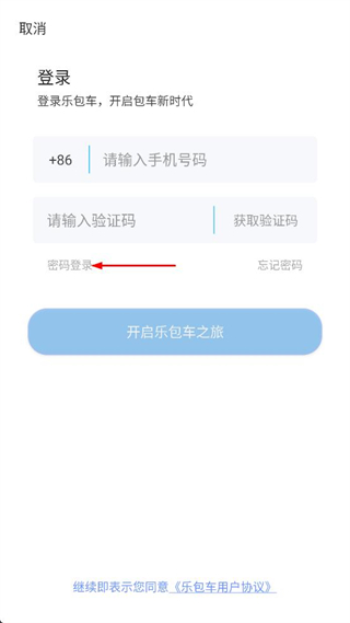 4、确认手机号码和密码已正确输入后,点击开启乐包车之旅按钮完成登录。