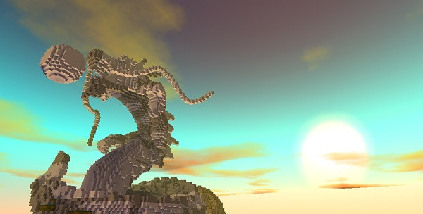 2、探索世界,遇到企鹅等生物可观察互动,前往开阔区域尝试建造(如巨龙雕塑),发挥创意。