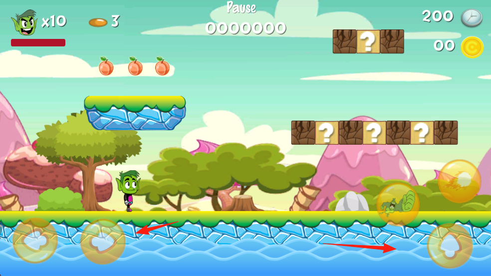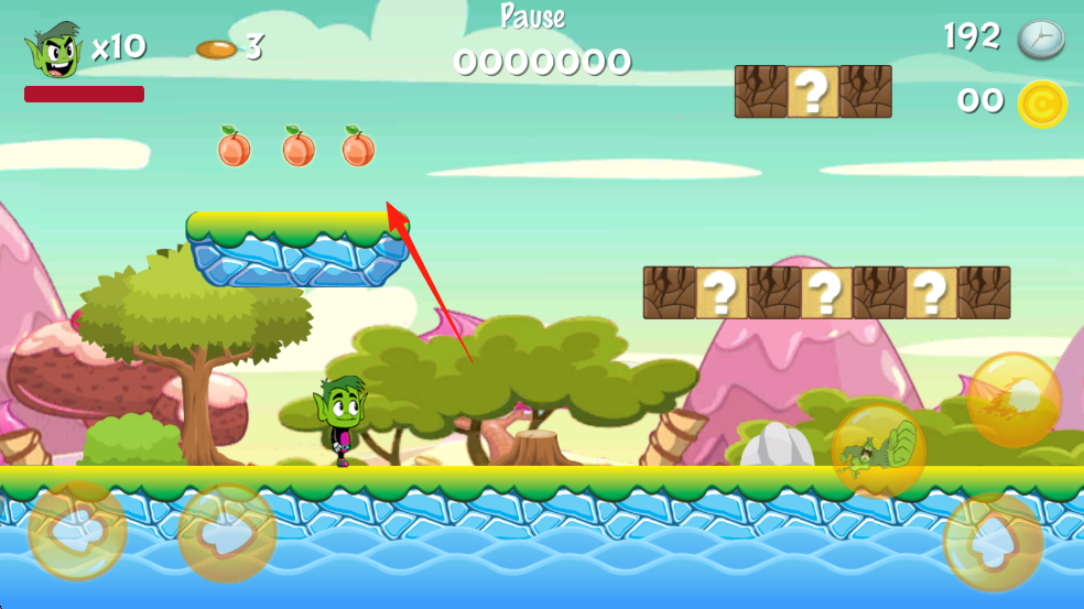 2、遇到冰块平台(红箭头),点击跳跃键(红箭头),跳上平台,收集桃子(道具),解锁问号砖块(奖励)。