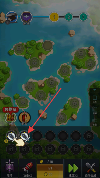1、点击下方带标识的空位,选择【炮塔】等防御建筑,部署到岛屿,构建防御基础。