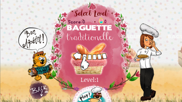 2、属于“SaladLevel”(沙拉关卡),当前是制作“Baguettetraditionelle”(传统法棍)的第1关,画面有分数(Score:0)、厨师角色、卡通猫咪等元素。