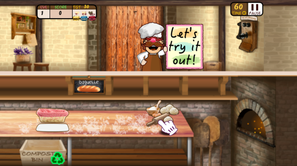 3、画面呈现面包店操作环境,含操作台、工具、“COMPOSTBIN”(堆肥箱)等元素,右上角有时间(60TIME)和暂停(PAUSE)按钮。