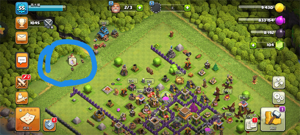 2、查看村庄地图,蓝色圈定位置为“建筑工人小屋”(或隐藏建筑),优先升级它以解锁更多建筑工人,关注金矿。