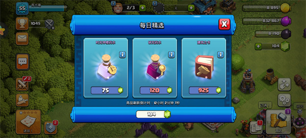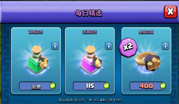 1、在每日精选界面,优先领取“免费”的训练药水(用于加速造兵),资源短缺时购买“资源药水”(花费115宝石)。