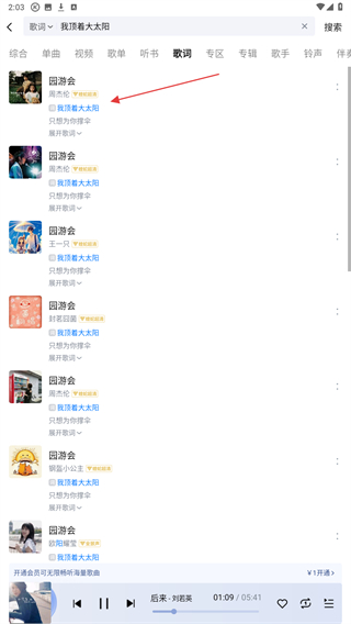 3、当搜索结果出来后,点击歌词的标签进行切换。