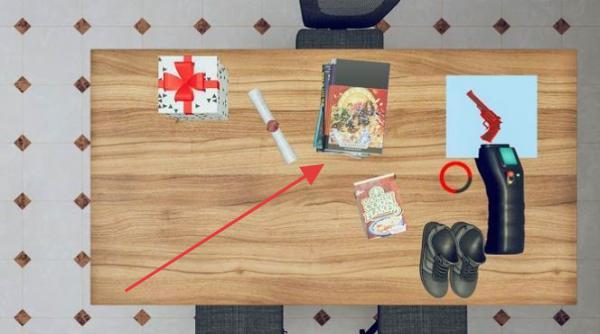 3、查看桌上物品,识别违禁品(如红色枪支),保留合规物品(书籍),处理违规物品,完成安检流程。