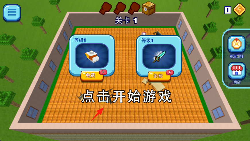 1、战前准备选关卡1,免费领武器(箱子剑),点击“开始游戏”,进入战斗房间。