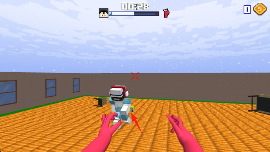 2、房间对战操控角色,用粉色手套武器,攻击敌人(像素角色),注意限时(00:28),躲避反击。