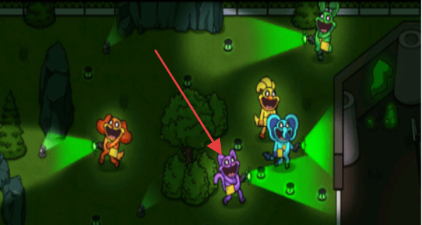 1、在夜间场景,操控箭头指向的紫色角色,利用绿光手电探索区域,与周围角色配合,应对潜在威胁。