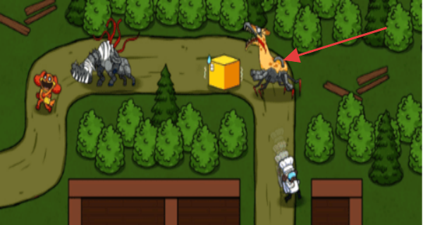 2、在路径关卡,布置角色拦截箭头指向的蜘蛛怪,保护中间黄色方块,阻止怪物突破,推进防御任务。