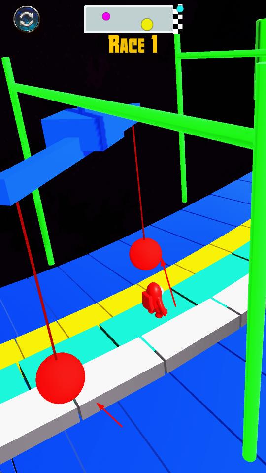 2、赛道中设有旋转拳头、摆锤等障碍,需及时调整角色路线,避开碰撞,保障行进。