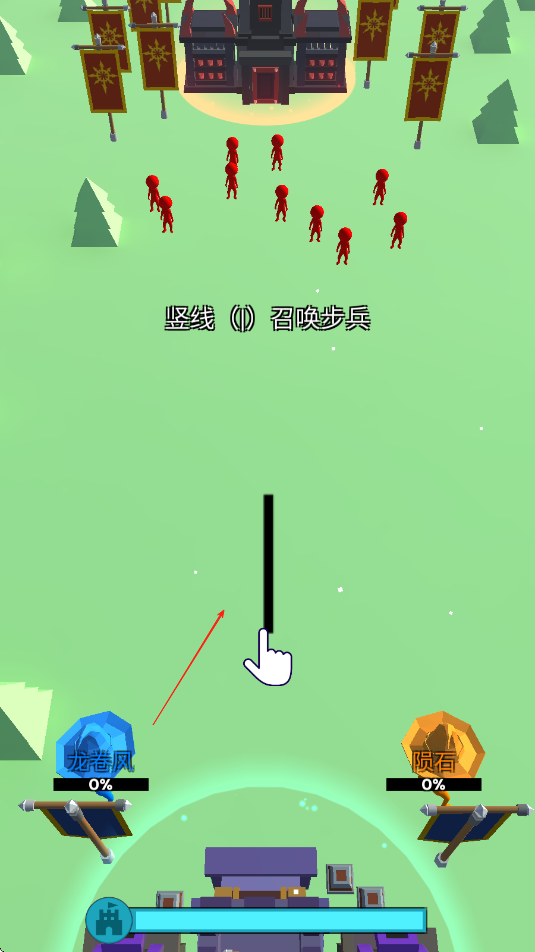 2、根据敌人类型选择绘画策略,面对近战敌人绘制盾牌形状增强防御,远程敌人则绘制弓箭图案召唤射手,滑动屏幕指挥小人移动攻击。