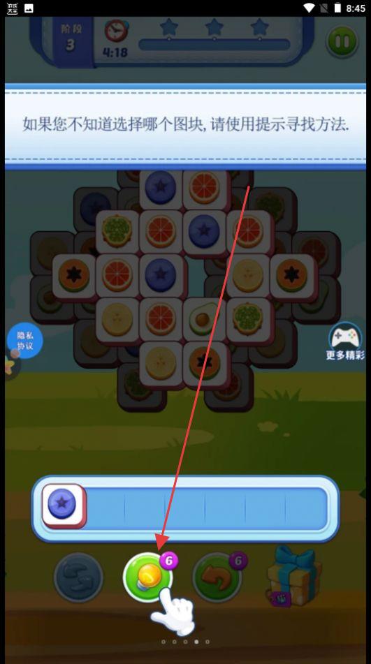 3、遇选择难题时,启用提示道具,获取消除线索,推进关卡目标。