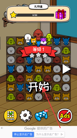 1、进入游戏界面,点击【开始】按钮,开启等级1挑战,通过消除同类型宠物推进,达30进度得礼盒。
