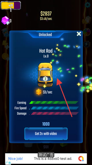 3、解锁【Hot Rod】车辆后,查看属性,可通过观看广告加倍收益,升级它提升赚钱、攻击等能力,助力战斗。