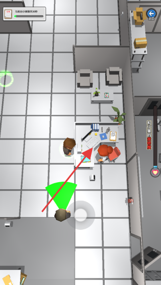 3、执行聊天任务,操控角色靠近目标工位,利用绿色视野范围,避开老板视线,成功触发聊天。