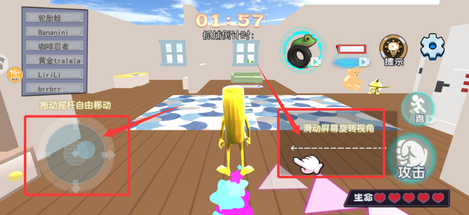 3、进入场景后,拖动左侧摇杆移动,滑动屏幕调整视角,搜寻或躲避,借助环境与道具博弈。