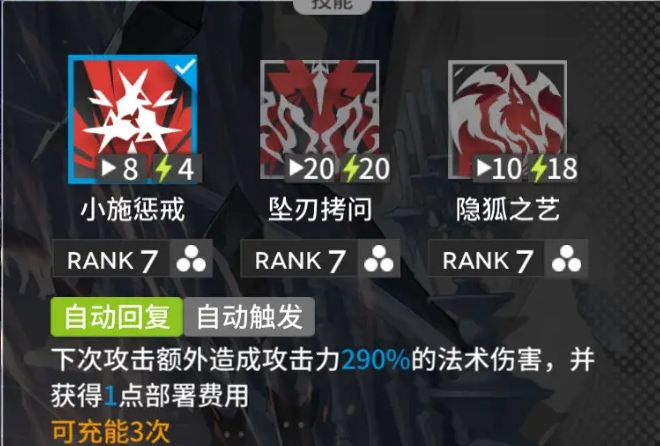 1、一技能·小施惩戒(自动触发):下次攻击附加290%法伤+1部署费(可充能3次),回费效率低、伤害偏凑数,适合挂机清杂,仅需7级基础效果,不推荐专精。