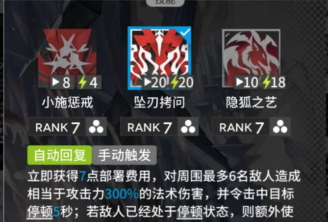 2、坠刃拷问:自动回复、手动触发,立即获7点部署费,对周围最多6名敌人造成300%法术伤害,命中目标停顿5秒,若目标已停顿,额外附加控制。