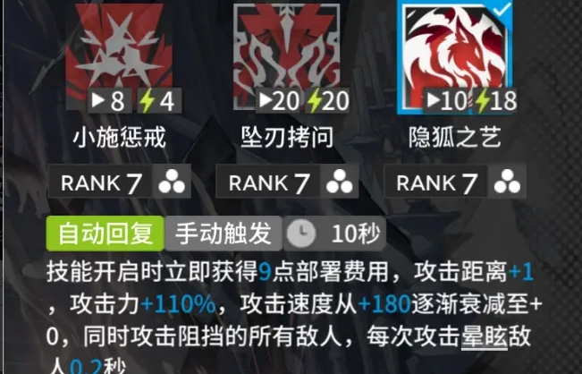 3、隐狐之艺:自动回复、手动触发(持续10秒),开启获9点部署费,攻击距离+1,攻击力+110%,攻速从+180%逐渐衰减,攻击阻挡的所有敌人。