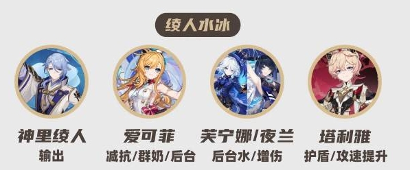 3、绫人水冰队(水伤冻结):神里绫人(水伤输出)+爱可菲(减水抗/群奶)+芙宁娜/夜兰(后台水/增伤)+塔利雅(攻速/护盾),爱可菲核心减抗,芙宁娜补足全队增伤。