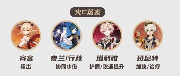 2、火C蒸发队(宵宫主C):组合夜兰/行秋(挂水触发蒸发)、班尼特(加攻/治疗),塔利雅护盾抗打断,攻速加成让宵宫多射3段箭。
