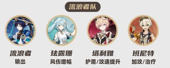 3、风C扩散队(流浪者核心):联动珐露珊(增攻减抗)、班尼特(增攻),塔利雅护盾护持+攻速拐,流浪者染水后靠普攻输出。