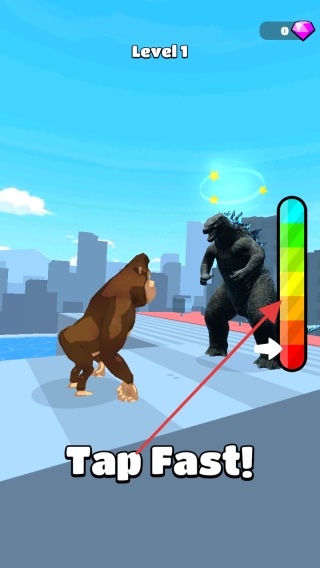 2、遇到哥斯拉时,按照【Tap Fast!】指引,快速点击屏幕,让大猩猩与哥斯拉互动,通过快速点击提升进度条数值,赢取对抗胜利,推进关卡。