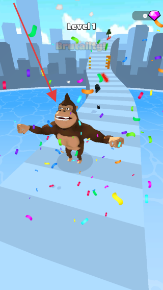 3、战胜哥斯拉后,大猩猩继续在道路上奔跑,穿过带有彩带的庆祝区域,保持移动,冲向关卡终点,完成Level1挑战,解锁后续关卡与内容。