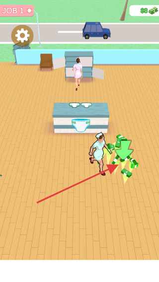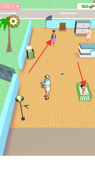 2、操控护士角色,跟随地上的绿色钞票指引,移动到对应区域(如放有尿布的桌子旁),完成物品收集或准备,为照顾孩子做准备,推进任务进度。