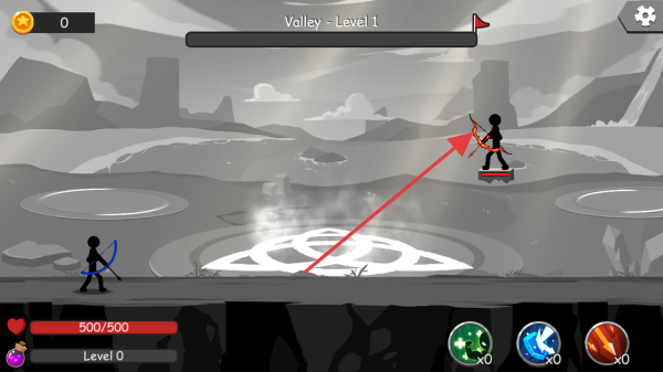 3、Valley-Level1中,操控己方弓箭手(红箭头角色),点击技能(下方图标)攻击敌人,利用地形走位,优先集火敌方输出,赢取胜利。