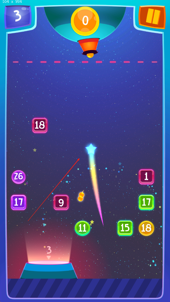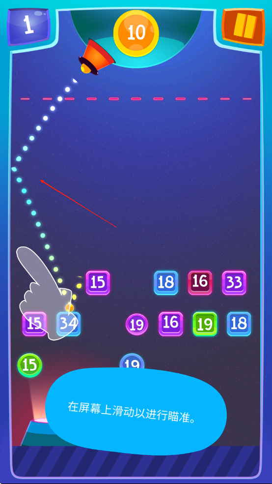1、进入游戏后左右滑动屏幕调整炮台角度,点击发射键射出炮弹,优先击打靠近警戒线的球球,利用反弹原理击中多层目标。