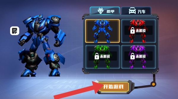 1、点击【开始游戏】(黄色按钮,可进入游戏),呈现机甲选择、准备开始的界面状态。