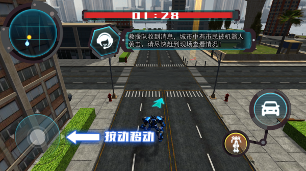 2、救援队消息“城市中有市民被机器人袭击,请尽快赶到现场查看情况”、操作提示“拨动移动”左上角雷达地图、技能/形态切换按钮,呈现机器人在城市执行救援任务的场景。