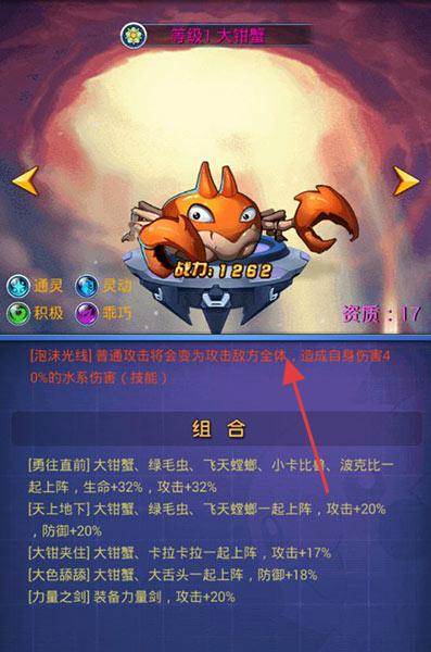 2、群攻:大钳蟹,【泡沫光线】普通攻击将会变为攻击敌方全体,造成自身伤害40%的水系伤害,(+4则伤害提升为60%)。