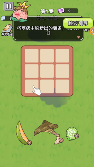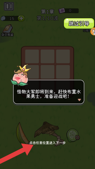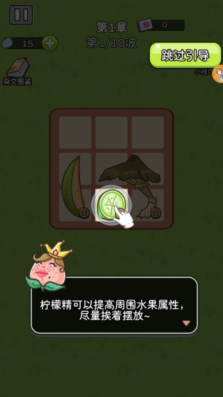 1、进度、功能按钮(跳过引导、杂交图鉴)、金币、提示文本,呈现的是初始关卡的引导场景,属于休闲塔防类玩法,玩家需布置水果抵御怪物波次。