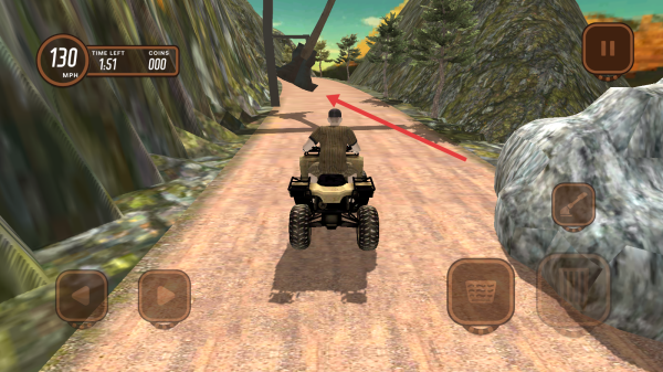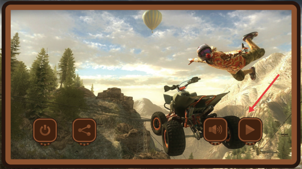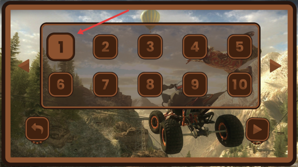 1、点播放键进选关,挑“1号”山地关卡,驾驶ATV,准备挑战特技与障碍。