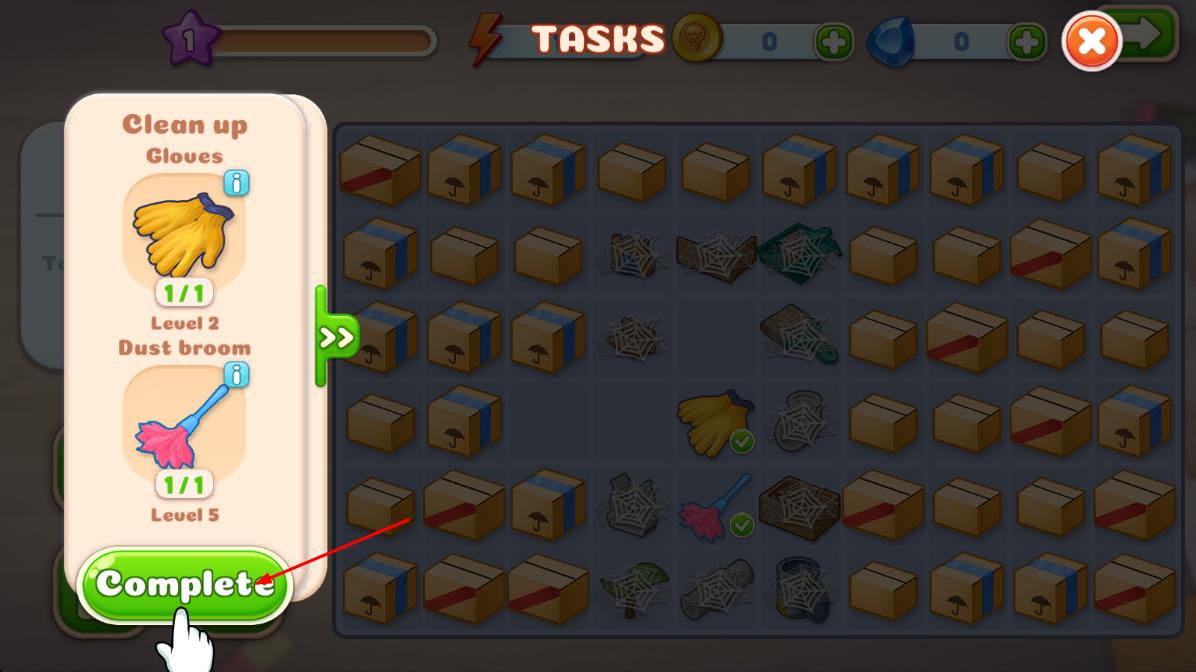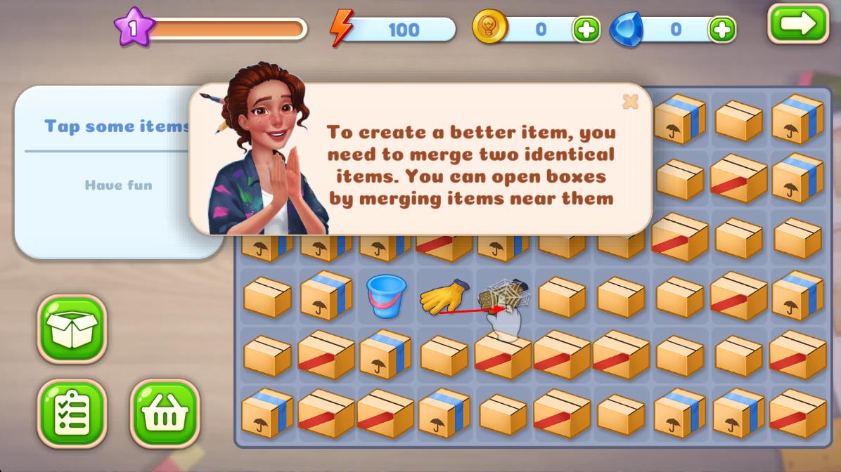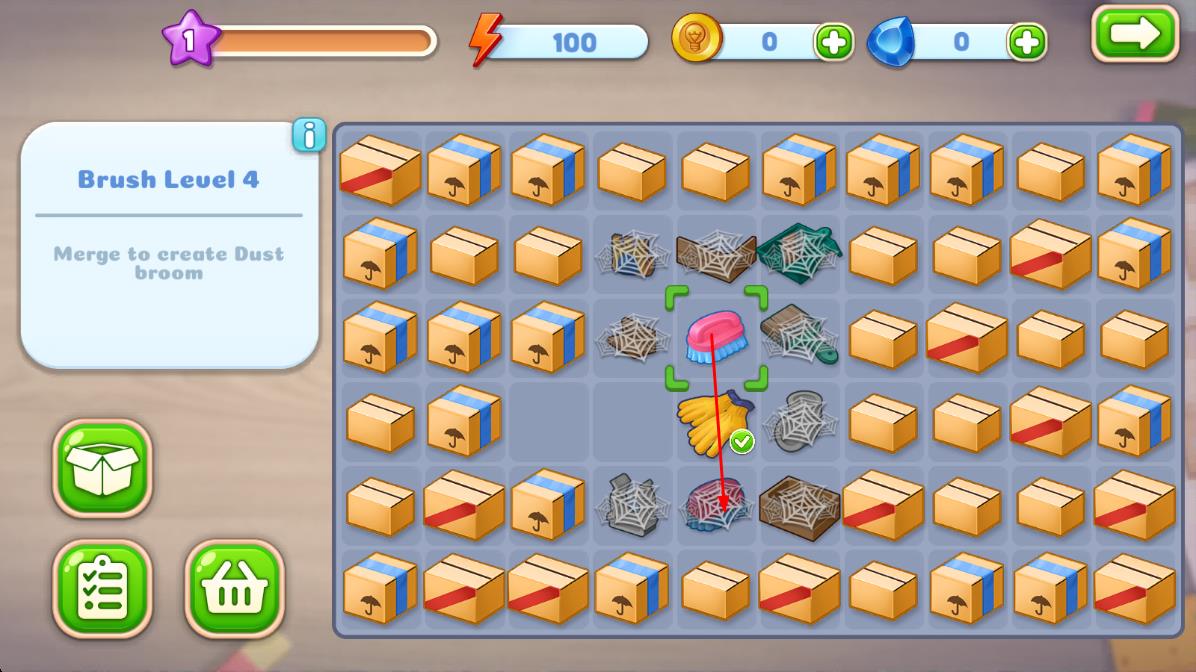 1、进入游戏后选择待装修房间,在初始场景中合并基础道具获取建材,为房间铺设地板墙面等基础硬装。