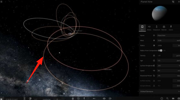 3、在轨道模拟界面,选中【行星轨道线条】,修改轨道参数(如半径、速度),观察行星九(PlanetNine)等天体运行变化。