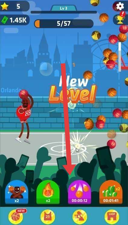 1、角色升级“New-Level”后,点击箭头指向的紫色技能,触发特殊效果,助力收集篮球,推进关卡进度(5/57→更高)。