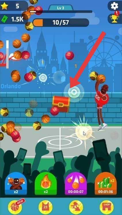 2、游戏中,瞄准箭头指向的宝箱,操控角色投篮命中,获取宝箱奖励,积累资源,升级技能或购买道具。